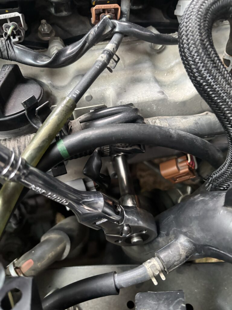 助手席側、エアクリーナーボックス横にイグニッションコイルが3つ、とても狭いとこについていました。エアクリーナーホースを緩めてずらしてなんとか作業場を作っていきます。